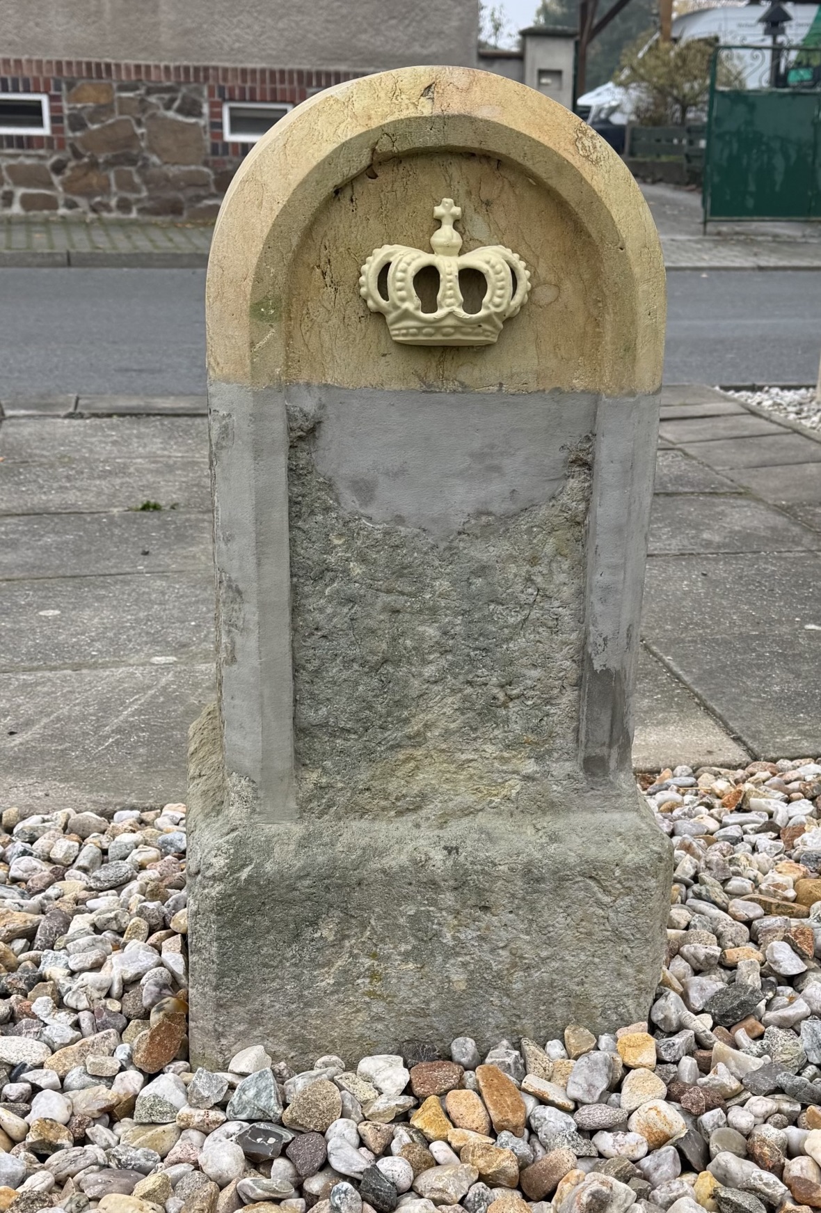 Der bei einem Unfall stark beschädigte Ganzmeilenstein mit Kilometerangaben von Steindörfel (Oberlausitz) wird im Auftrag der Straßenmeisterei Nostitz (LASuV Bautzen) seit Februar 2025 von Steinbildhauerin Maria Kaiser aus Medingen instand gesetzt. (Foto links)